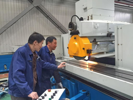 操作工(gong)和檢驗(yan)員正在(zai)驗收出(chu)口機床(chuang)M7150*16/HZ